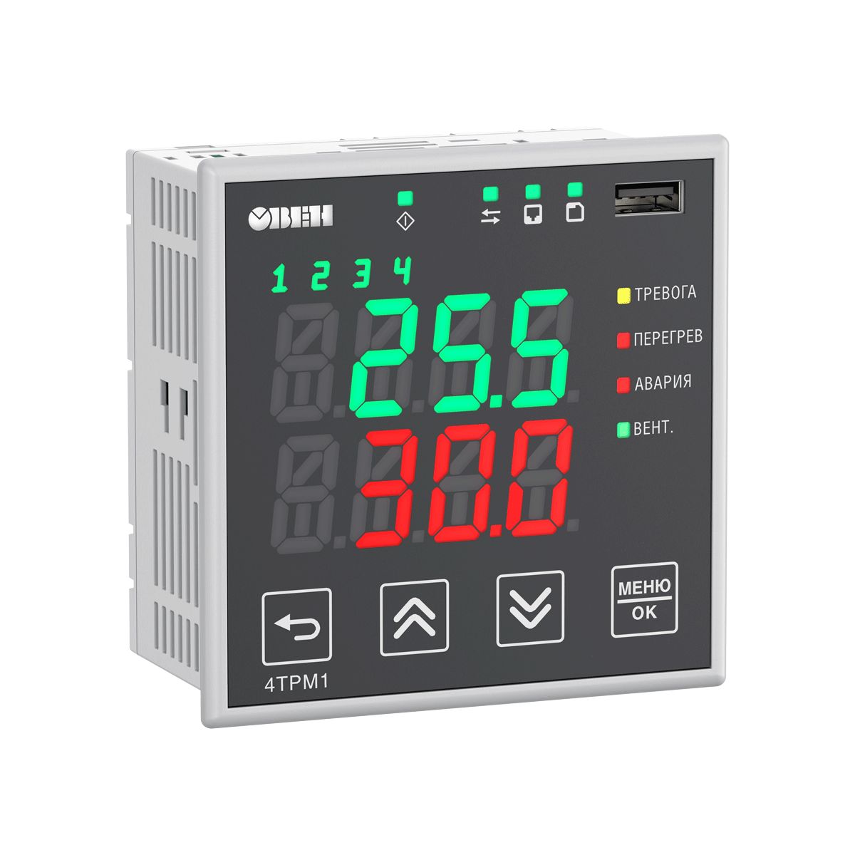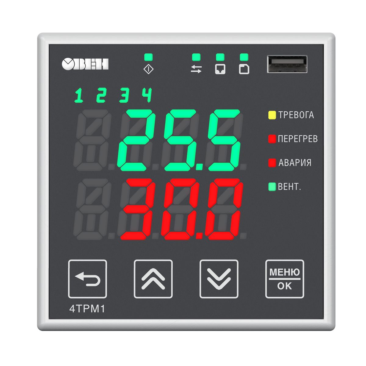 4ТРМ1-ТР оснащен трехцветной индикацией: зеленой, желтой и красной. В зависимости от измеренной температуры индикаторы автоматически изменяют цвет, сигнализируя о приближении к пороговым значениям или превышении допустимого температурного диапазона.