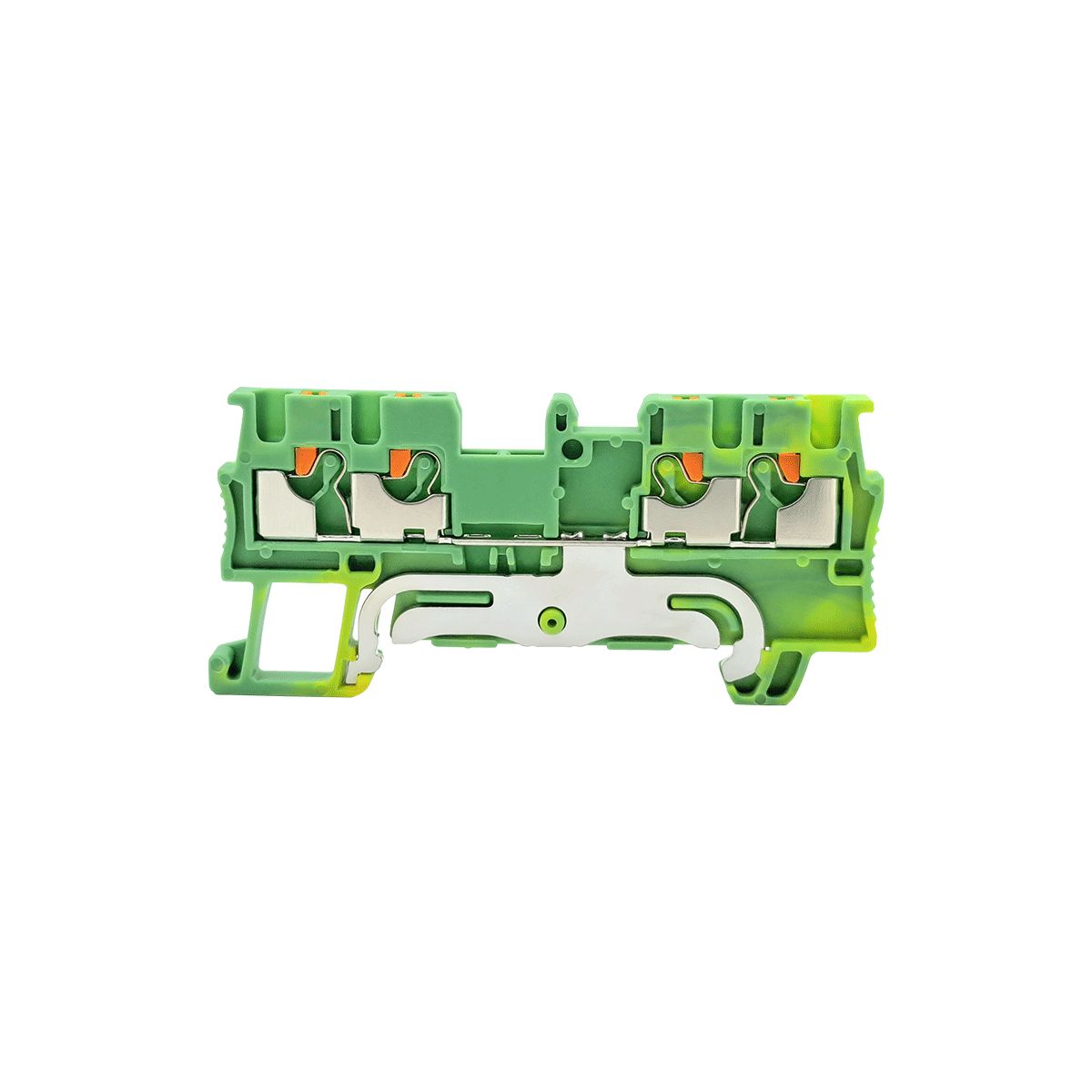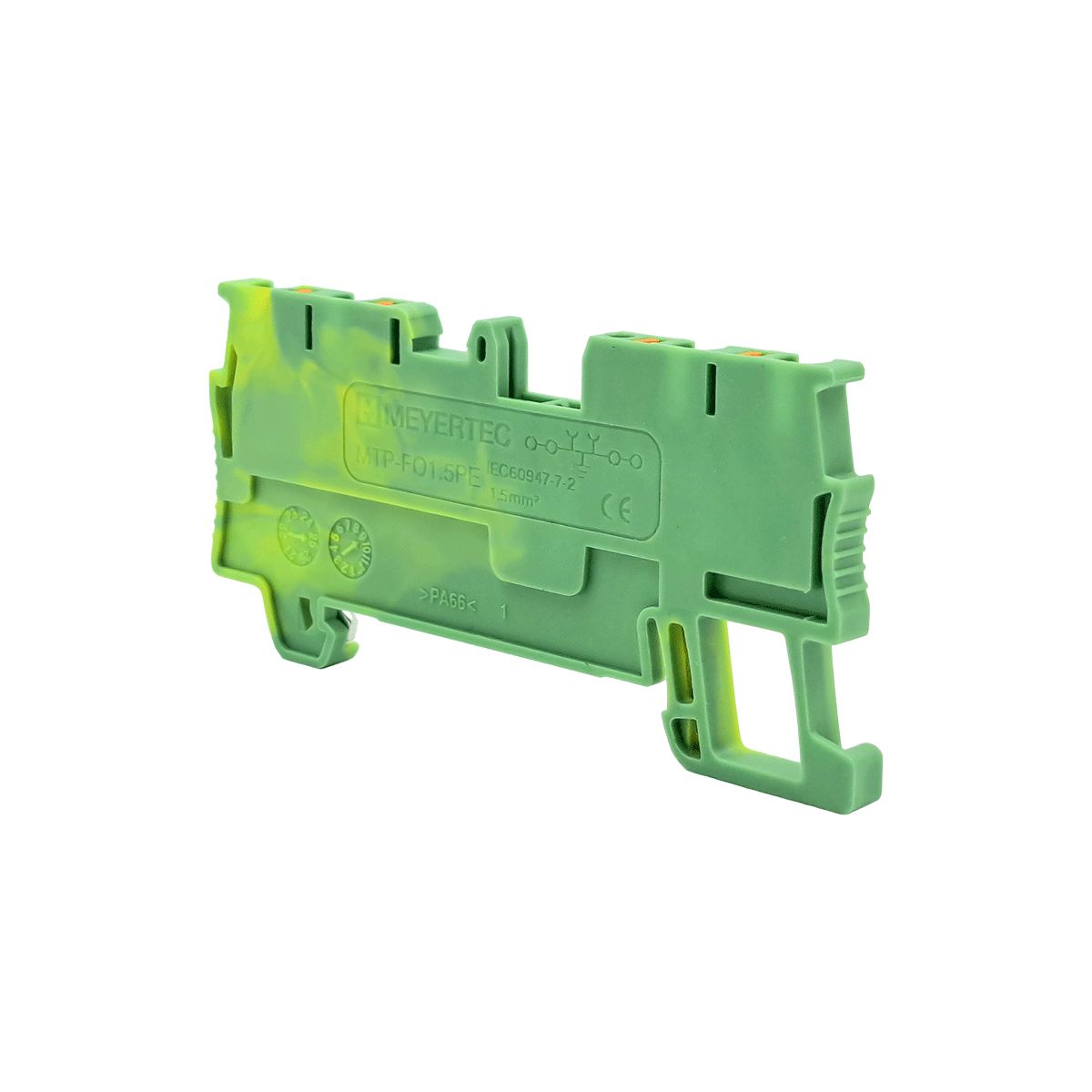 Заземляющие четырехпроводные push-in клеммы MTP-FO1.5PE применяются для подключения защитных заземляющих проводников. Клемма фиксируется на DIN-рейке простым защелкиванием без использования инструментов.